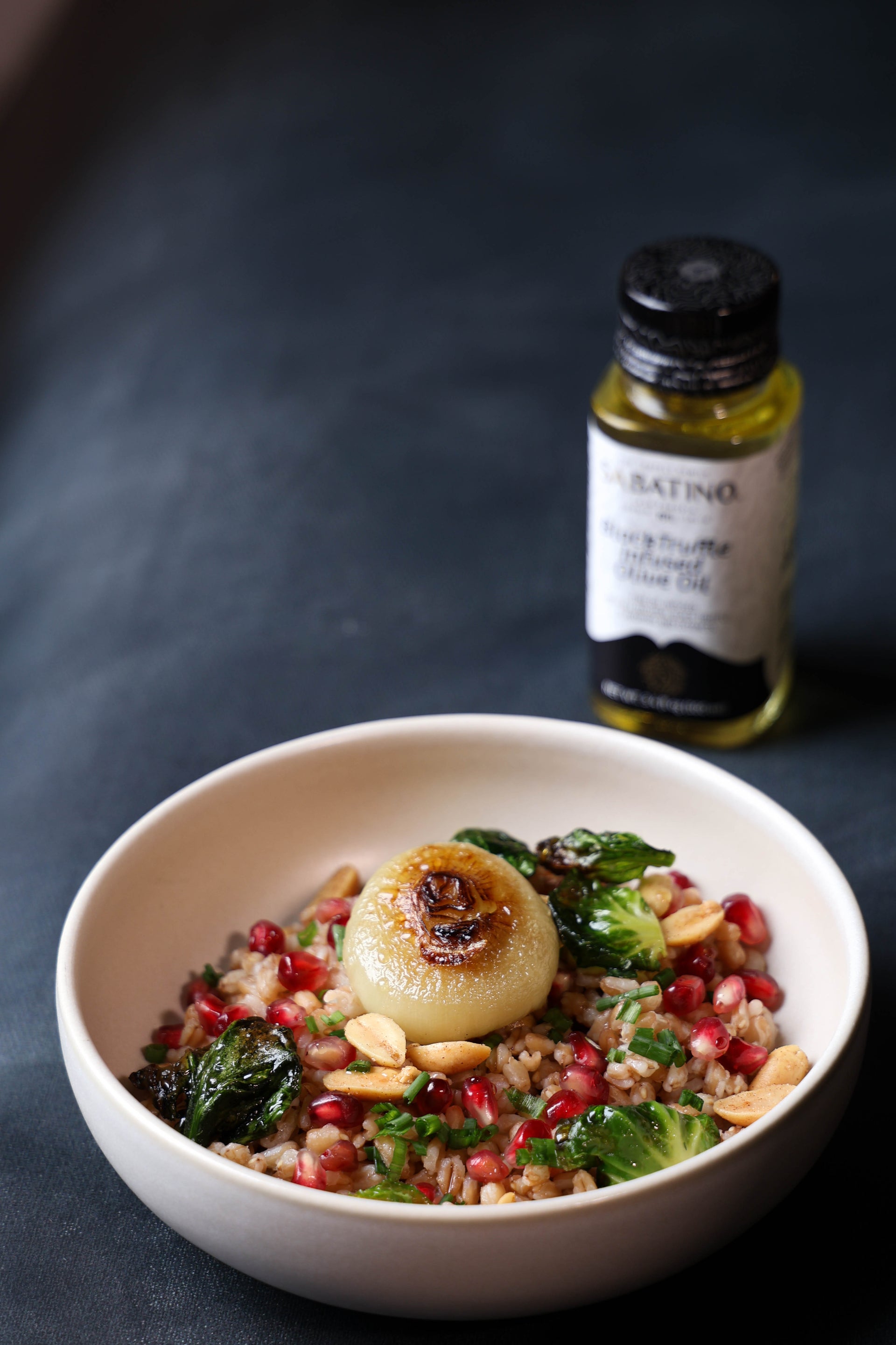 - Combine: In a large mixing bowl, add the cooked farro, roasted Brussels sprouts, caramelized onions, pomegranate seeds, and truffle salt peanuts. Drizzle with Black Truffle Oil and toss to combine.